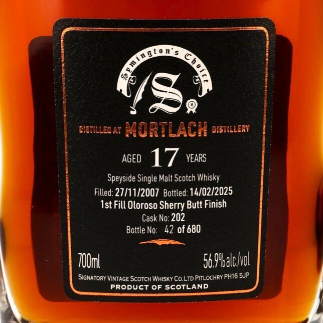 MORTLACH 17 SYMINGTON'S CHOICE Speyside Single Malt Scotch Whisky (Signatory Vintage) / 1st Fill Oloroso Sherry Butt No. 202 / 17 y.o. 2007 - 2025 / 56,9 % Vol. / 0,7 l / Geschenkbox