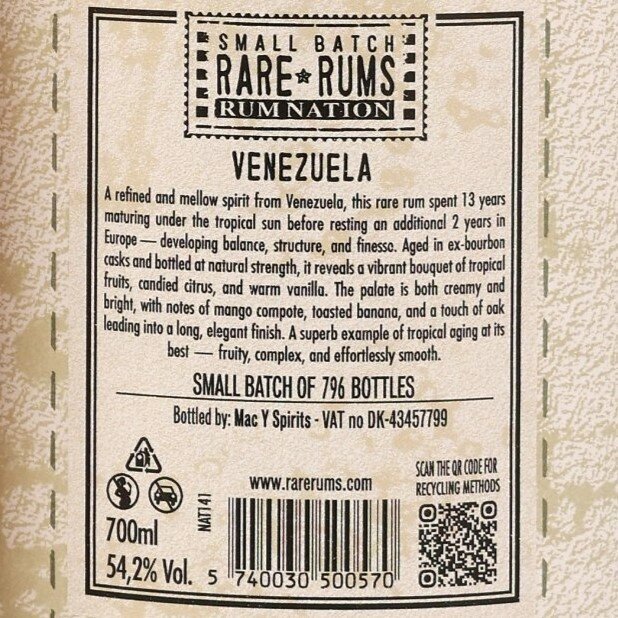 Rum Nation VENEZUELA 2010 Small Batch Rare Rum / 15 y.o. 2010 - 2025 / 54,2 % Vol. / 0,7 l / Geschenkverpackung